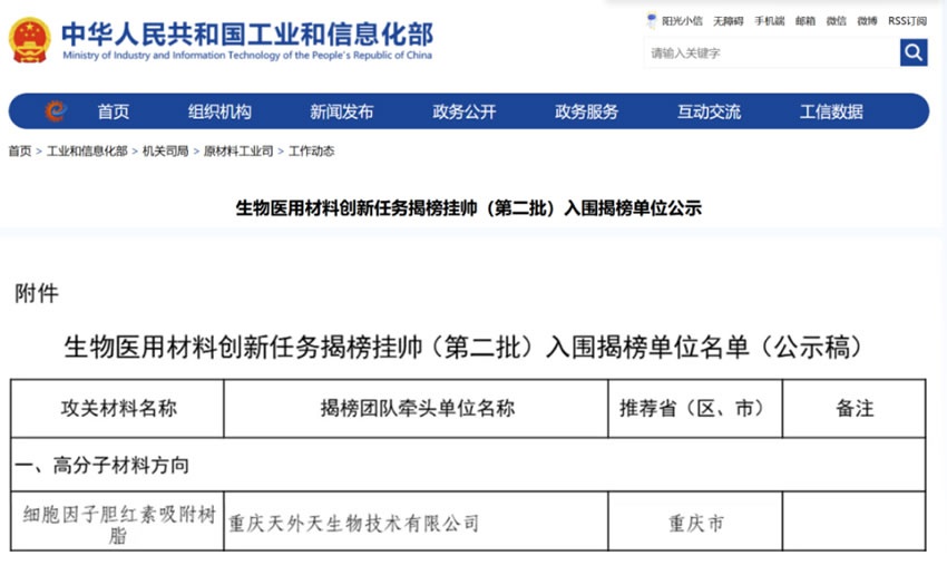 2025年8月26日,工業和信息化部、國家藥品監督管理局聯合公示了《生物醫用材料創新任務揭榜掛帥(第二批)入圍揭榜單位名單》。重慶山外山血液凈化技術股份有限公司(“山外山”,科創板股票代碼:688410)全資子公司 —— 重慶天外天生物技術有限公司(簡稱“天外天”),憑借“細胞因子膽紅素吸附樹脂”成功入圍第二批國家生物醫用材料創新任務“揭榜掛帥” 單位。